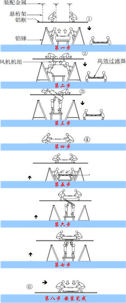 兩位工作人員扶著鋁梯,把FFU風(fēng)機機組抬上天花板去,F(xiàn)FU風(fēng)機在搬運過程中,應(yīng)始終處于水平狀態(tài),由在天花板的兩位安裝人員接應(yīng)。
