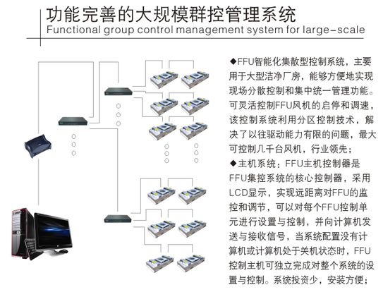 FFU群控系統(tǒng),主要用于大型潔凈房間,能夠方便地實現(xiàn)現(xiàn)場分散控制和集中統(tǒng)一管理功能。可靈活控制FFU風(fēng)機的啟停和調(diào)速,該控制系統(tǒng)利用分區(qū)控制技術(shù),解決了485驅(qū)動能力有限的問題,最大可控制幾千臺風(fēng)機,F(xiàn)FU群控系統(tǒng),高等級凈化廠房使用。
